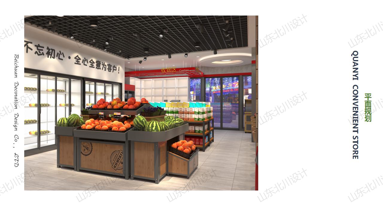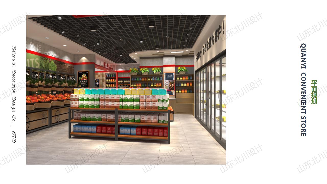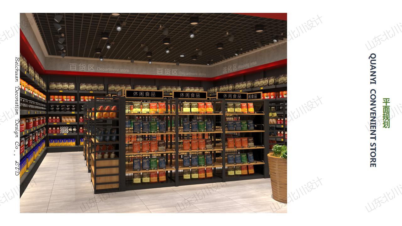 一、平面規劃:平面布局中充分考慮了本項目的建筑結構較為復雜,稱重墻較多,原有空間利用不夠充分等特點,物業形態以及項目所在的社區的客群,消費能力,結合超市固有的特點(如裝修風格定位、貨架的樣式、貨架規格,購物通道大小等的設置)并考慮超市客群動線的合理性和適當延長以及有意避免因建筑戶型限制而形成的購物死角,因本項目客群只要是學生和家長針對這一特點布局規劃上進行了特殊陳列,兒童食品,散稱食品以及生鮮進行前置布局,吸引客群,形成人流量較多的購物氛圍,百貨洗化等慢銷品進行了后置,布局特點迎合特定主要客群,有效降低快銷品損耗,實現營業利潤最大化;
