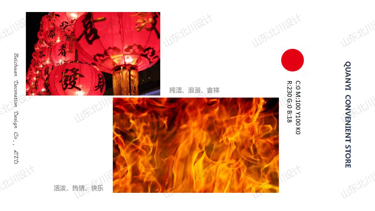 三、裝修色彩定位:超市客群以幼兒和小學生為主,故裝修色彩定位為較為鮮艷的紅色為主題色,以較為穩重的青色藏青色為輔助色,黑白灰等無色系為基礎色調。形成穩重又不乏靈活和對比的視覺感受;
